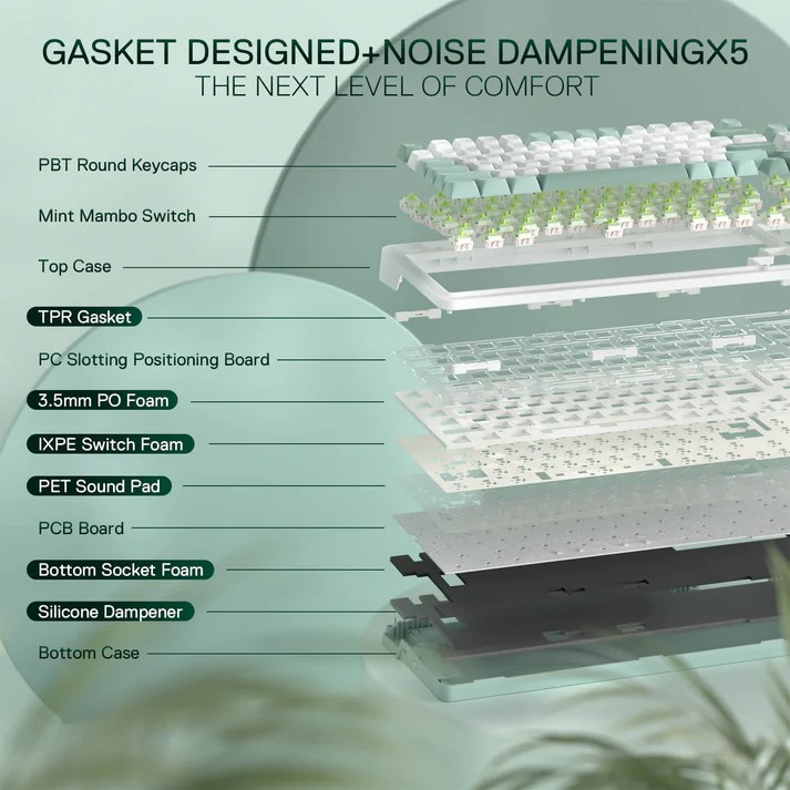 The body structure differs from traditional screw fixing by using precision-locked covers with gaskets to assist with noise reduction and flexibility. It provides even feedback while the vertical cushioning reduces rigid noise, delivering a crisp, clean and softer typing feel.